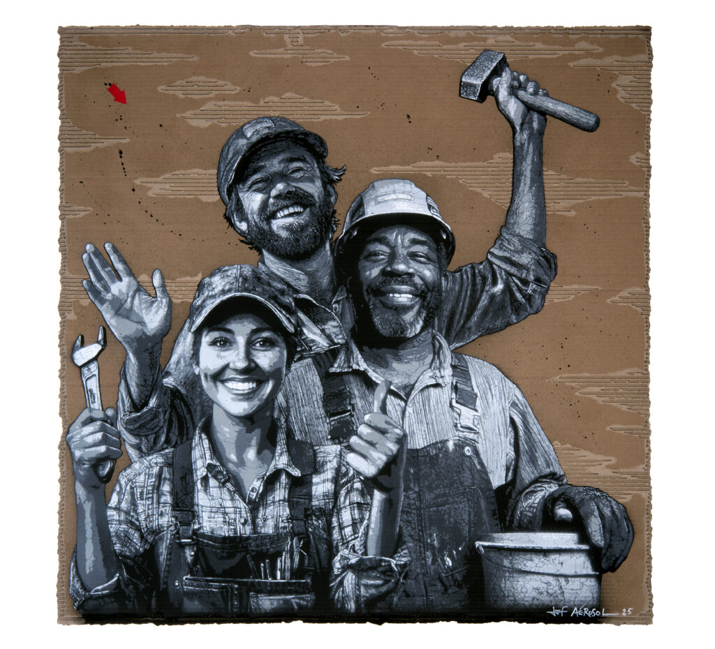 Avec l’œuvre “ARTisanat …”, Jef Aérosol rend hommage à tous les professionnels du second œuvre : électriciens, plombiers, poseurs, agenceurs, menuisiers, peintres, serruriers, couvreurs, chauffagistes… Ils sont les mains qui construisent, rénovent, entretiennent. Ceux qui, par leurs gestes maîtrisés et leurs savoir-faire techniques, façonnent notre quotidien.